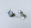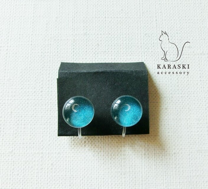 銀色の三日月を描いた絵を、樹脂で閉じ込めたイヤリングです。