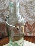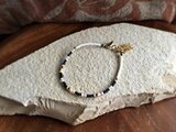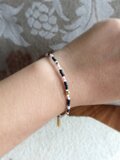 ホワイトビーズをベースに玉虫色に光る黒ビーズと間にピンクビーズを組み合わせたシンプルで可愛らしいブレスレットです。