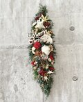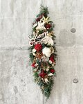 花材:プリザーブドフラワーヒムロスギ・サグリナム・ブルーアイス・マウンテンジュニパー・ドライフラワースターコーン・ヒイラギ・シダローズ・カラマツ・ムイリーコーン・ワタ・バクリ・ワタカラ・アーバンナッツ・ソーラーローズ・スターオーナメント・トナカイ・ガーランド・メリークリスマスロゴなど