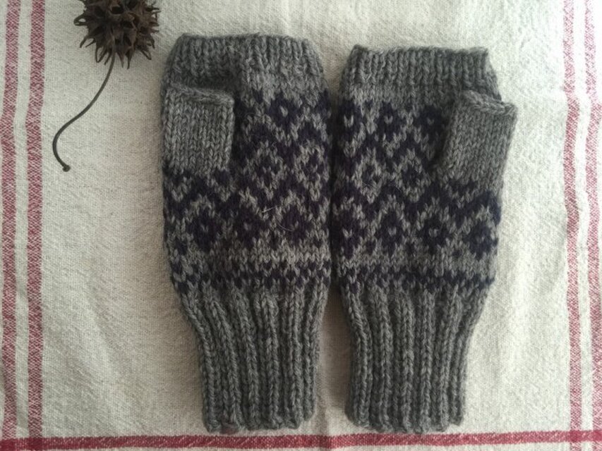 グレーをベースに紺色で伝統柄を編み込みました