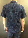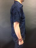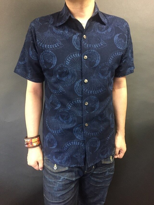 吉兆藍木綿半袖シャツ(扇と鶴紋様)