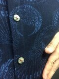 新作手作り吉兆藍木綿和柄シャツ(扇と鶴紋様)