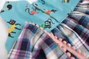 背中がスナップボタンになっていて着脱しやすい形になります。ギャザーがたっぷり入ったスカートの裾にはポンポンをつけて可愛らしく、色合いは秋をイメージして仕上げました…♪