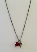 ショートケーキのメタルチャームに、イチゴのイメージで深い赤の直径10㎜のスワロフスキー(カラー:シャム)を、ケーキ皿に敷くレースペーパーのイメージで白いレース金具を組み合わせました。