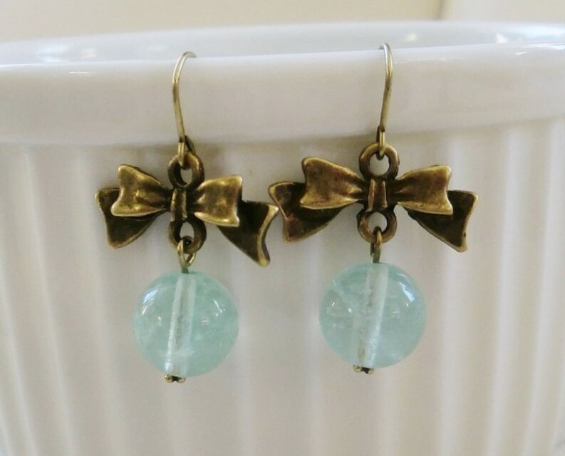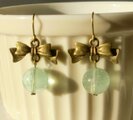直径10㎜の天然石・フローライトとリボンのメタルパーツを組み合わせたフック式ピアスです。