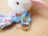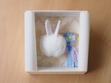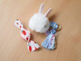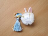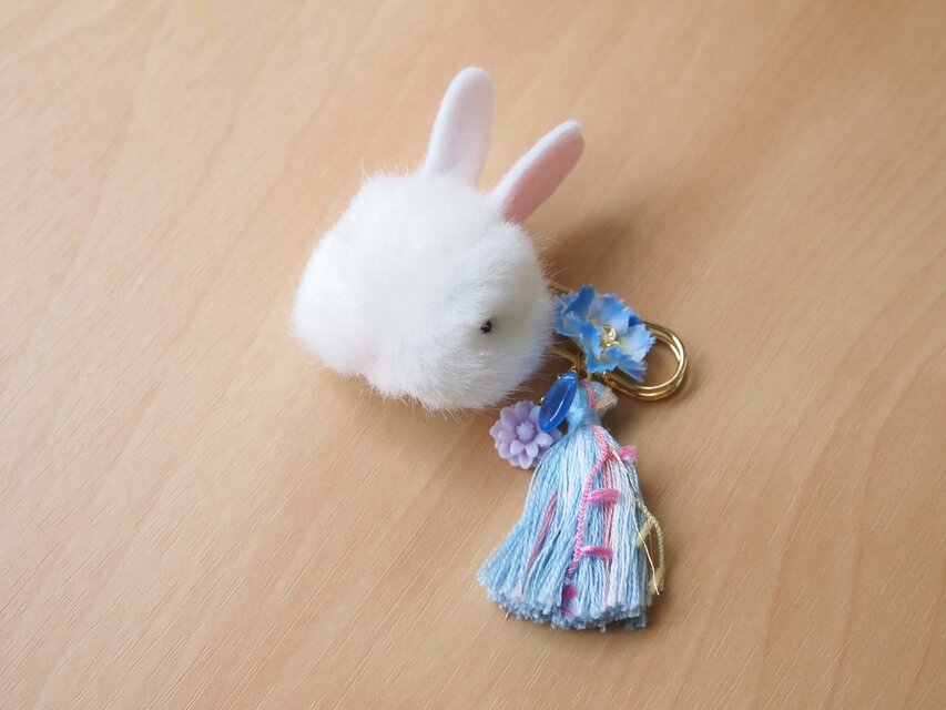矢車菊をイメージした、さわやかな色合いの房飾りを下げた白うさぎ。