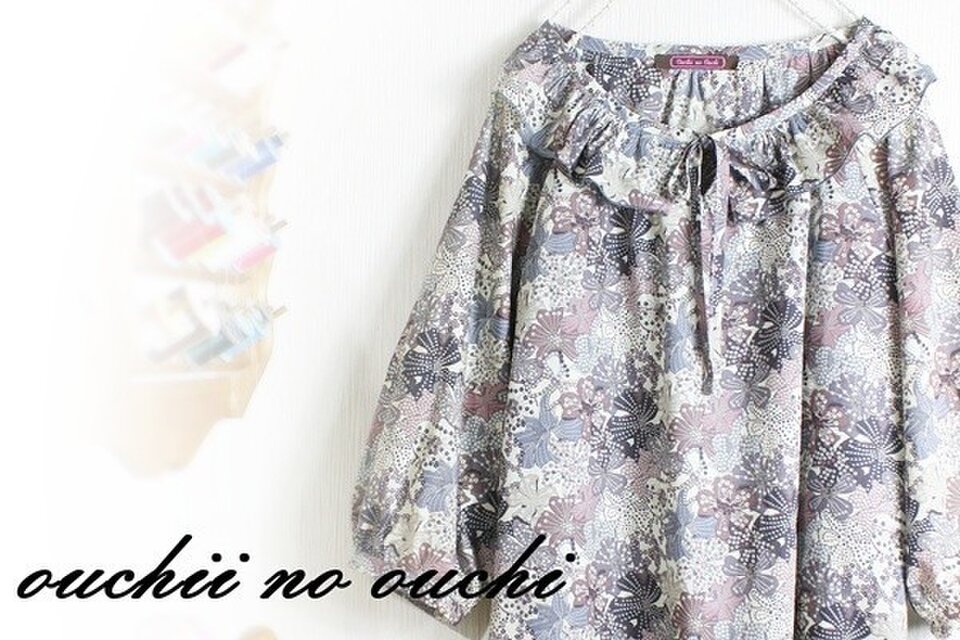 秋にむけてリバティタナローン大人気柄 英国リバティMauvey モーヴィで巻きロック仕上げのフリル襟リボンラグランロングブラウスを作りました。
