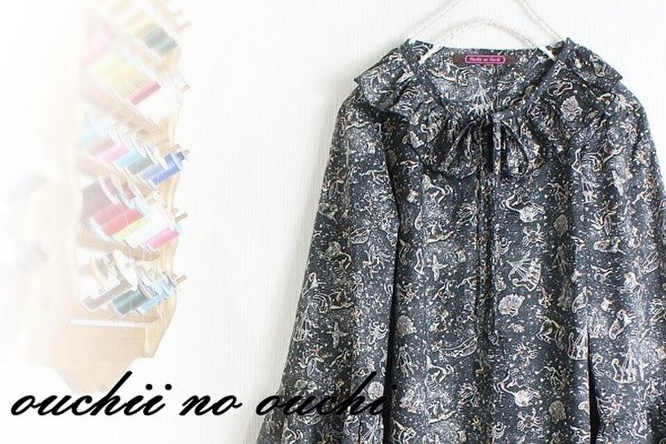 秋にむけてリバティタナローン2014秋冬柄 <Kevin>(ケヴィン)ブラック系で巻きロック仕上げのフリル襟のリボンブラウスを作りました。