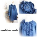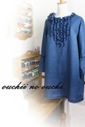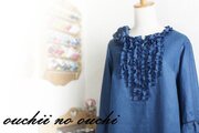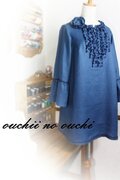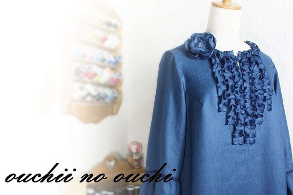 秋にピッタリな しっとりリネンブルーで作った巻きロックフリル仕上げのワンピースです。
