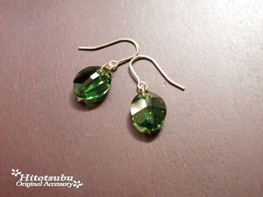 スワロフスキーの一粒ピアス。2012年秋冬の新カット、「ピュアリーフ」を使用しました。カラーは「ファーングリーン」、お顔周りに良く映える輝きの強い大人色。程良い大きさで季節・服装を問わず使い回せます♪