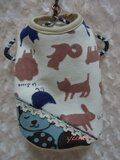 先程 受け取りました。 有難うございました。生地の裏表を上手に使っていて、とってもかわいく ムギに良く似合い気に入りました。 結構 伸縮の良い生地だったので 首周りがもう少し細くても 良かったかもしれません。でも、ゆったり着れるので 大丈夫ですよ。今日は、こんなお天気なので 無理ですが 晴れている日にこれを着て お出かけしたいと思います。 ほんとに有難うございました。