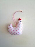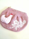 優しいピンクのリネン生地と、同じく優しいピンクドットのにわとりさんです。