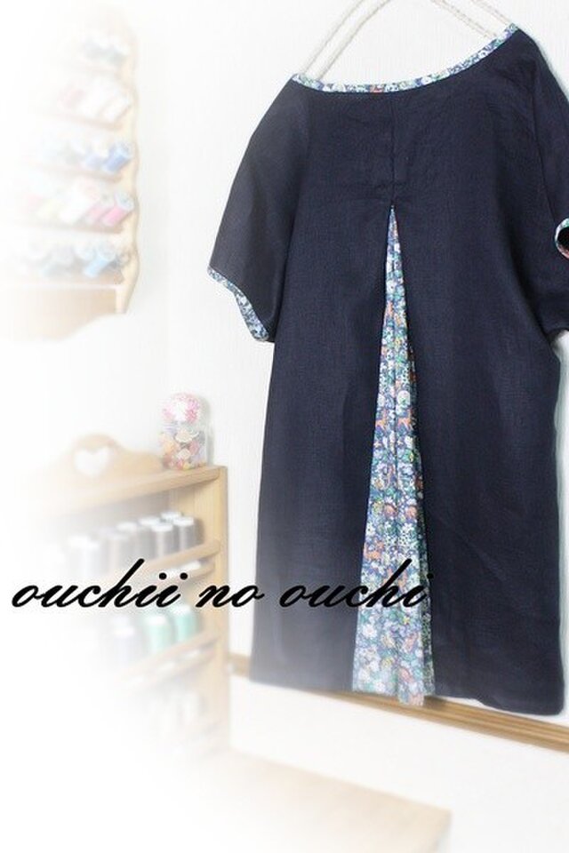 後ろ切り替え部分にリバティタナローンの大人気柄Fergusファーガスブルーのをいれたドルマンタイプのチュニックブラウスです。