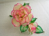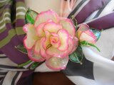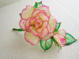 モナコ公妃となったアメリカの女優グレースケリーのために作られた品種プリンセス ドゥ モナコをアメリカンフラワーの技法で作った薔薇のコサージュです。レジンでコーティングしてありますので丈夫です。お使いにならないときは一輪挿しやグラスに飾っておいても素敵です。