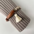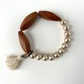 ベージュのコットンパールとうねりデザインのウッドビーズのコンビ、ホワイトのプチタッセルをチャームにしたゴムブレスレットです。