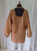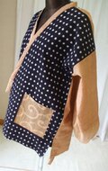 雪んこ絣を活かした服をと思い柿渋染めした木綿の着物の胴裏部分(木綿)を使い併せてみました。ポケットも唐草模様の風呂敷を柿渋で染めたものです。作務衣より衿を細くしてシャープな感じにしてみました。