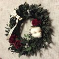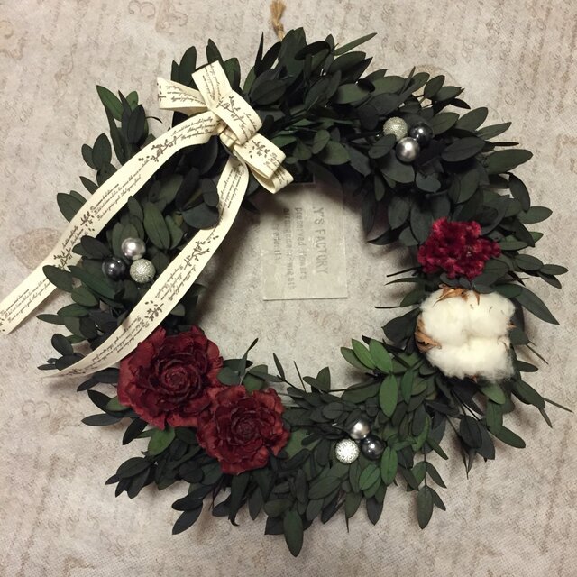 こちらはプリザーブドのユーカリ小葉とボルドーのシダーローズ、ケイトウ、ホワイトコットンの実を使い制作いたしました。