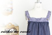 肩ひも、ポケット部分はボタンホールあきでウッドボタンと