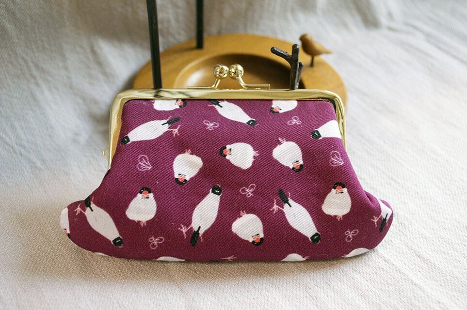 文鳥のかわいいと感じるしぐさやポーズを自身で描き、それを生地にしてがまぐちをつくっています。