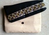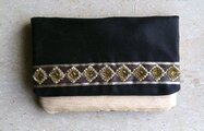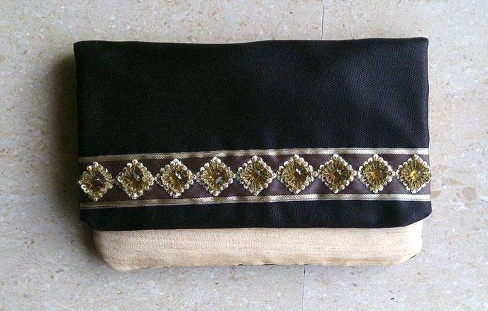 ヴィンテージのビジューを手縫いであしらったサリー用ボーダーを付けて、クラッチバッグを作りました。