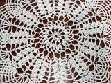 手編みレースドイリーです。色はアイボリーホワイトです。大きさ直径約30cm。パイナップル編みとまわりの縁編みが 可愛らしいデザインです。四季を通じてお使いいただけます。糊付けアイロンがけ仕上げ済みです。一針一針丁寧に編み上げました。