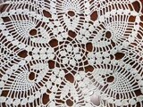 手編みレースドイリーです。大きさ直径約30cm。色はアイボリーホワイトです。パイナップル編みが特徴で豪華なデザインです。四季を通じてご使用になれます。いろいろな用途にどうぞ。糊付けアイロンがけ仕上げ済みです。一針一針丁寧に編み上げました。