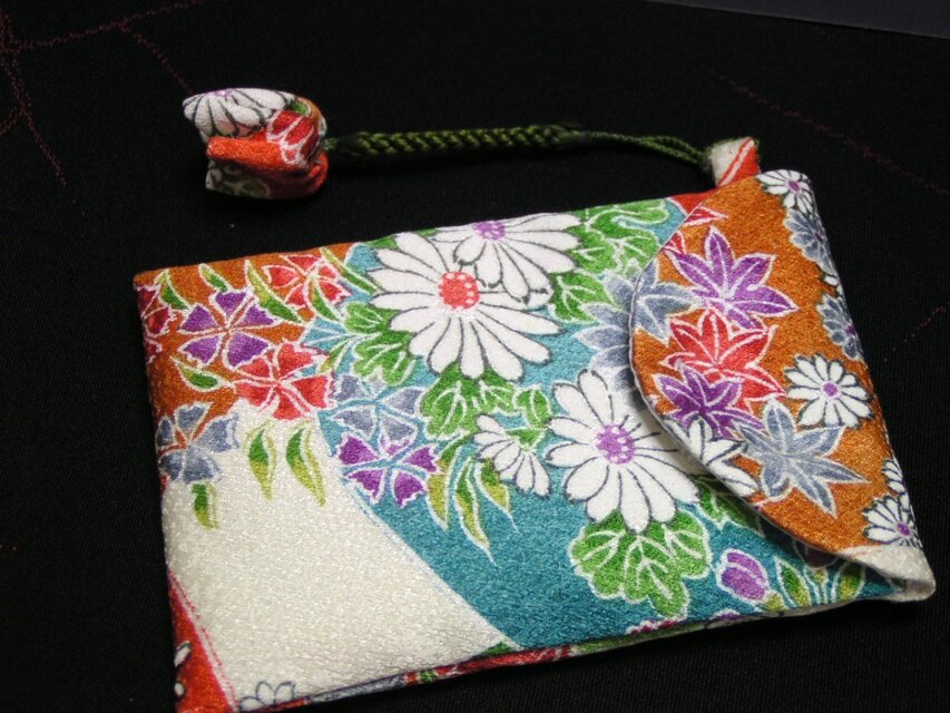 着物の反物を小物作品に仕立てますと、丁寧な柄付けが一層際立ちました。