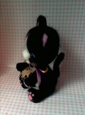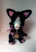 羊毛フェルトで作った黒ねこちゃんです。首にはHandmadeと印したチャーム、ビーズで作ったカボチャをつけています。