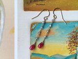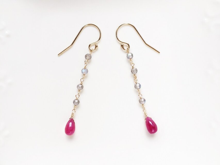 4粒つなげたラブラドライトは、蝶の羽のような美しい虹色(光学効果)が魅力ですが、こちらはトップクオリティのボタンカットですので、一粒一粒にラブラドレッセンスが見られ、神秘的な輝きを楽しめます。光源や見る角度によってグレーや透明にも見えますが、それがまたルビーを一層引き立てる魅力的なピアスです。