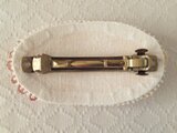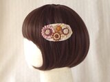 厚めの布地のデイジーと珈琲染めしたレースのお花に、ペップと刺繍した花芯をつけたバレッタ。