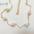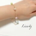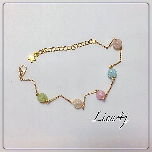アメ玉のような美味しそうなクラック水晶と組み合わせてみたら素敵なブレスレットに仕上がりました(^.^)パステルカラーは色味を抑えた色なので子どもっぽくなく大人可愛い雰囲気になっています(^.^)