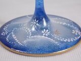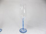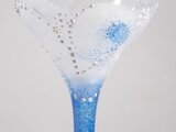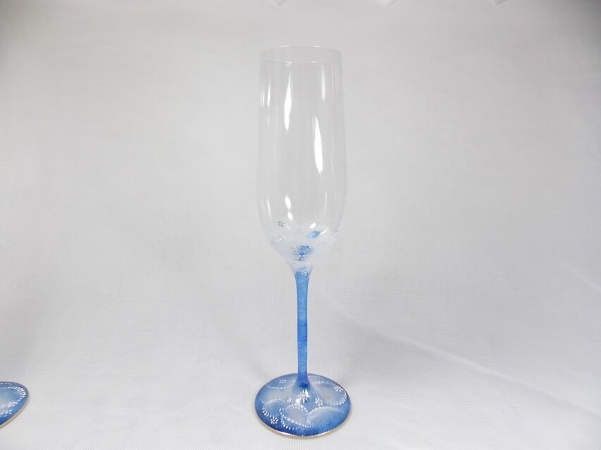 ガラスのシャンパングラスに宇宙を描き水の星座(かに・さそり・うお)を手描き致しました。青がきれいです。手で持った時のプツプツ感が印象的です。