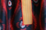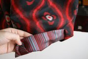 ピンクや紫系の生地を使い、華やかな印象のスカートです。ナチュラルなコーディネートにパンチを効かせたい時には、うってつけだと思います。ゴムウエストなので着心地楽ちんで、秋冬にお楽しみいただけます。裏も銘仙生地を使っています。