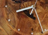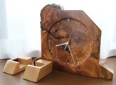 黒松の切り株特有の大きなヒビや松脂が固化した風合いと外皮の部分も残し、現在のインテリにもあうイメージで制作した置き時計です。単体でも自立しますが、安定性を高めるために別途赤松材で足の補助材を準備してあります。補助材には、置く場所・本体に傷がつないよう接触面にフェルトを貼ってあります。