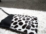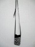 首掛け、斜め掛けできるスマホケースです。しっかりしつつも柔らかな革です。ポケットは白黒(こげ茶っぽい)の牛ハラコでとてもおしゃれ。