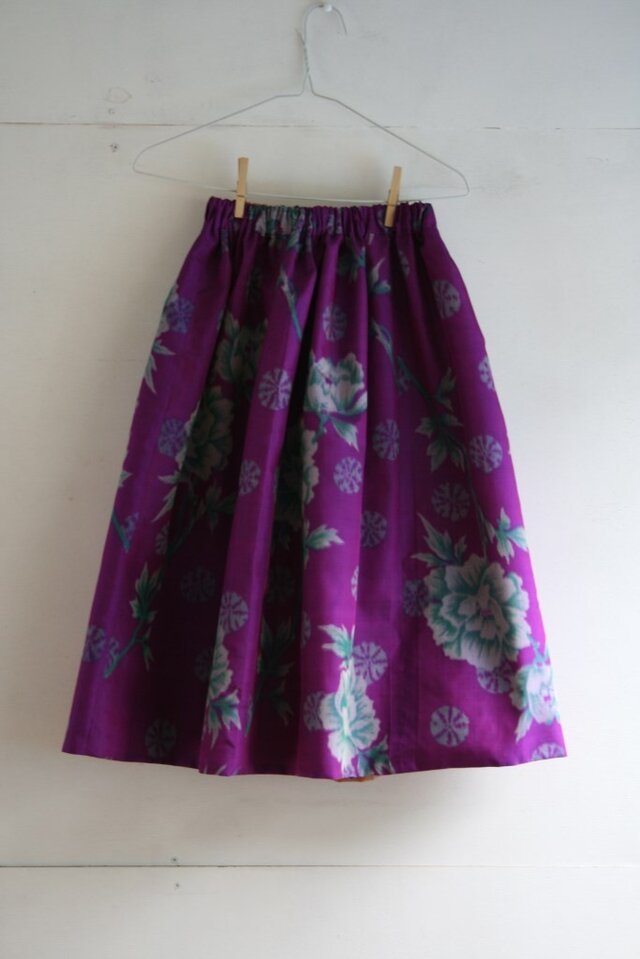 昭和に作られたと思われる着物やコート生地でボリュームのあるギャザーゴムスカートを作りました。