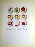 クロスステッチでひとつひとつ手縫いしたくるみボタンを年賀状にしました。