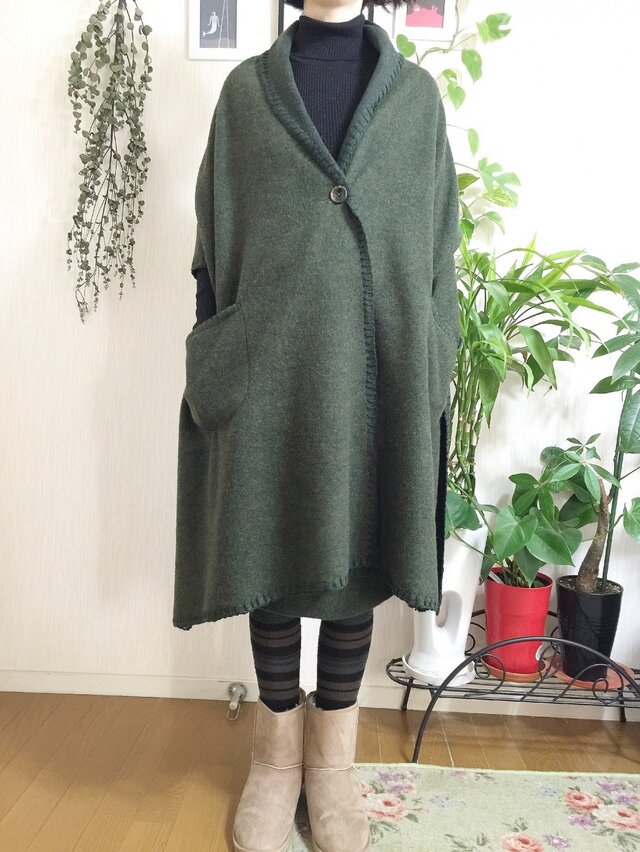 ストールにもパッチポケットとボタンを一つ付けています。羽織りの感覚で着る感じのストールになりました。