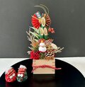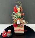 花材:ドライフラワー松かさ・ソーラーローズ・蓮の実・アーティフィシャルフラワーえぞ松・マム・ベリー・笹・シダー・青竹・組紐・手毬プレート・迎春ピック・鏡餅チリメンピック