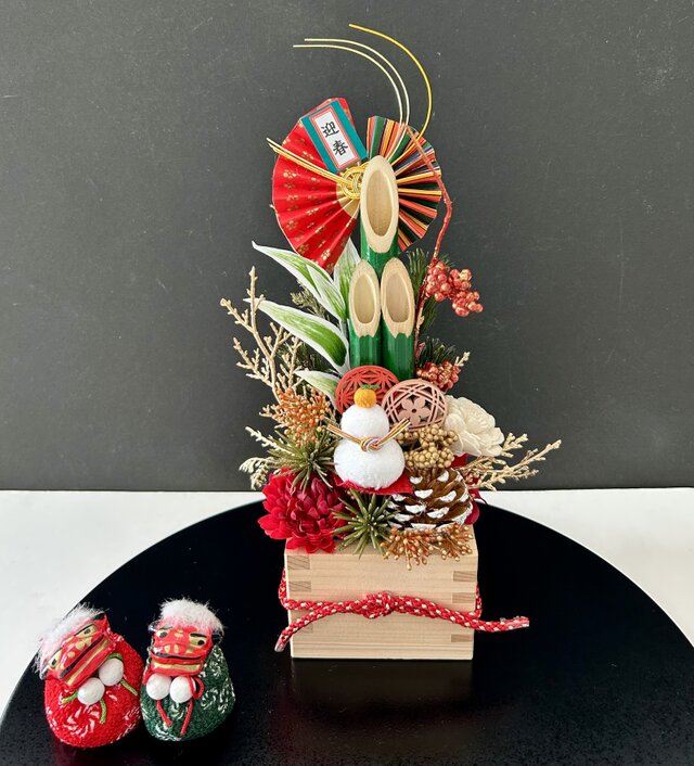 檜枡にアーティフィシャルフラワーの華やかなお正月アレンジ