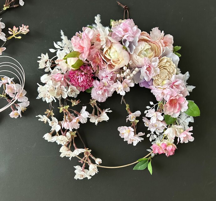 花材:アーティフィシャルフラワー桜・枝垂れ桜・ラナンキュラス・ビバーナム・紫陽花・ベリー・リーフ