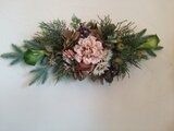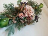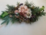 モミの木やヒバなどのクリスマスらしい枝物をベースに淡いグリーンのカラーやベージュのダリアなどをあわせてすっきりと仕上げました。