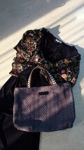 持ち手は、ヴィンテージもののボーダーを縫いつけました。深みのある紫と金色が高級感を与えてくれます。持ち手の巾は4.5cmとかなり太くてがっしりしています。