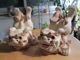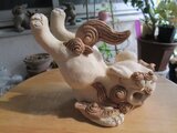 逆さになったシーサーが前足を踏ん張って威嚇しています。