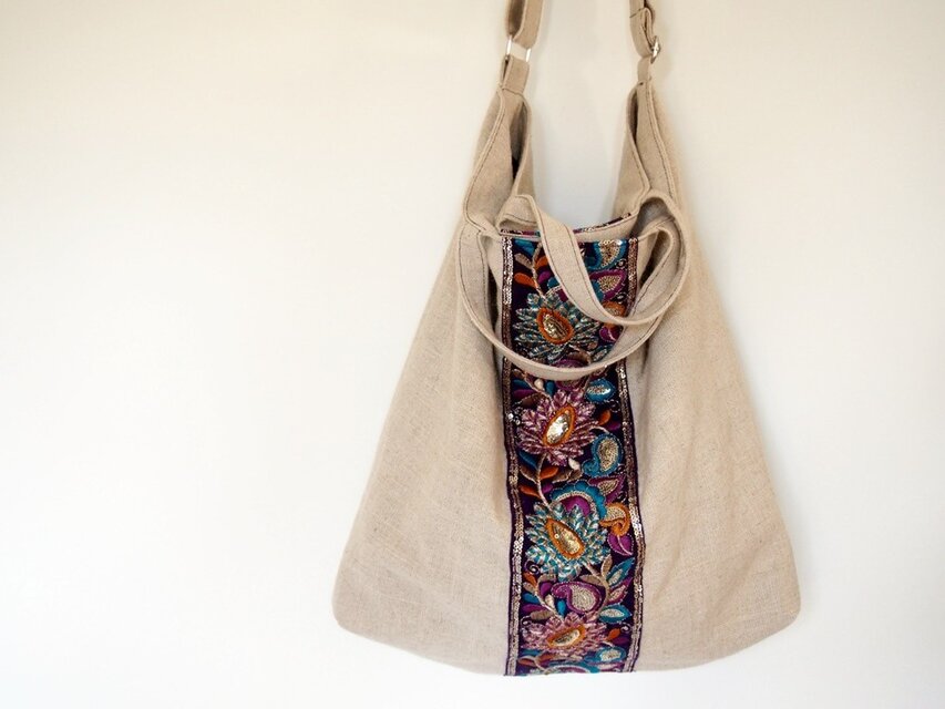 厚手のナチュラルカラーのリネン生地に、幅広のスパンコールテープをたたきつけました。