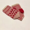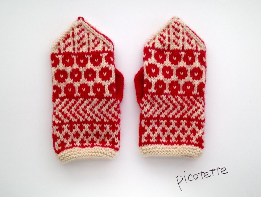 鮮やかというよりは落ち着いた深め赤色と、生成りのような色の毛糸を使用しているため、かわい過ぎない大人のミトンになっています。