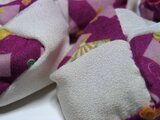 絹のつややかな白生地と鶴や扇面、松竹梅のおめでたい柄の紫色が綺麗なお手玉になりました。