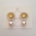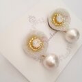 一枚ずつスパンコールを編みつけたお花。その下にコットンパールを揺らしたら、ふんわりと柔らかいピアスになりました。