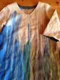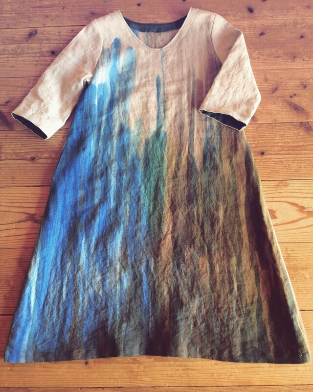 日本製リネンに何度も何度も重ね染めし、刷毛の動きや滲みの味わいを出した布で仕立てた、個性的なワンピース♡