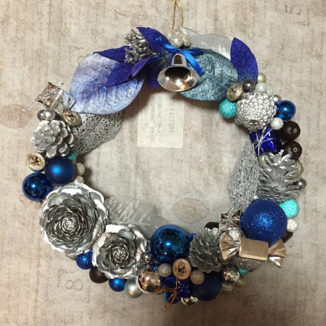 こちらはシルバーに着色したシダーローズをメインに、シルバーのまつぼっくりやオーナメントを使い制作いたしましたクリスマスリースです。